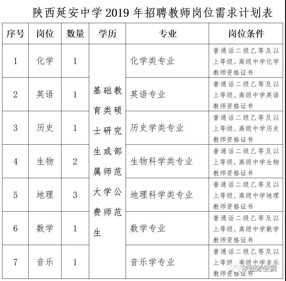 为进一步加强教师队伍建设,根据《陕西省事业单位公开招聘工作人员实施办法》(陕人社发〔2012〕105号)和《延安市人力资源和社会保障局关于对2019年延安中学招聘部属师范大学公费师范生和基础教育类研究生的批复》(延人社发〔2018〕238号)精神,面向社会公开招聘教师,现将有关事项公告如下: