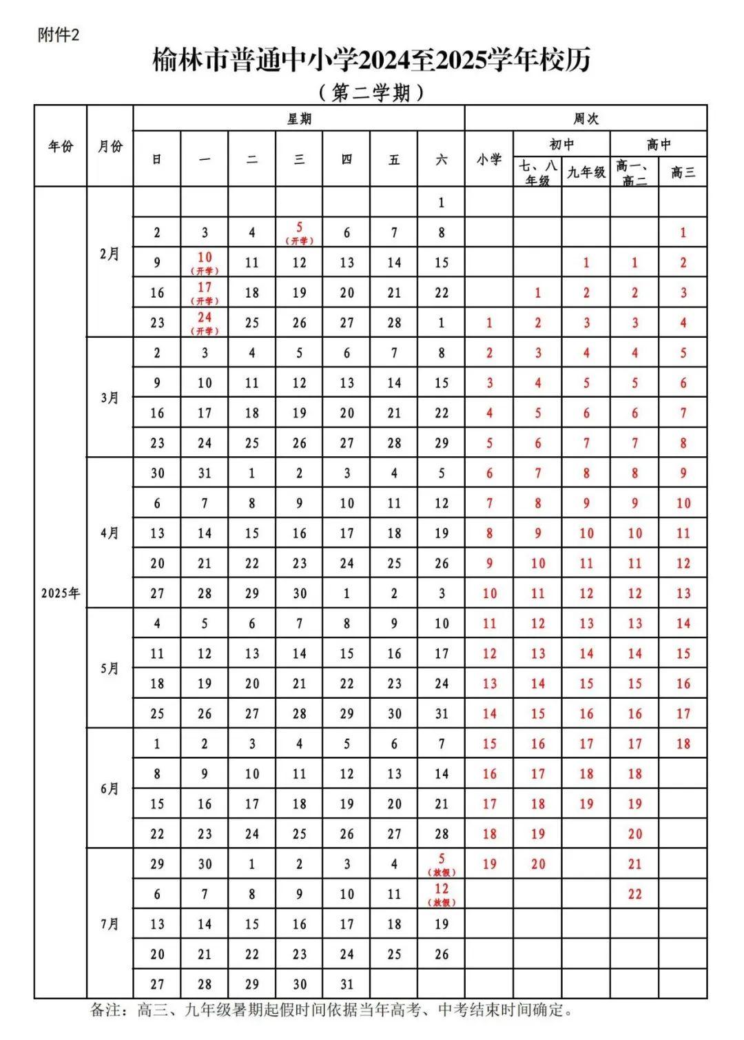 高中(普通高中、中等职业学校):高一、高二年级于2025年2月10日(星期一)开学上课,7月12日(星期六)放假,全学期共22周。高三年级于2025年2月5日(星期三)开学上课。